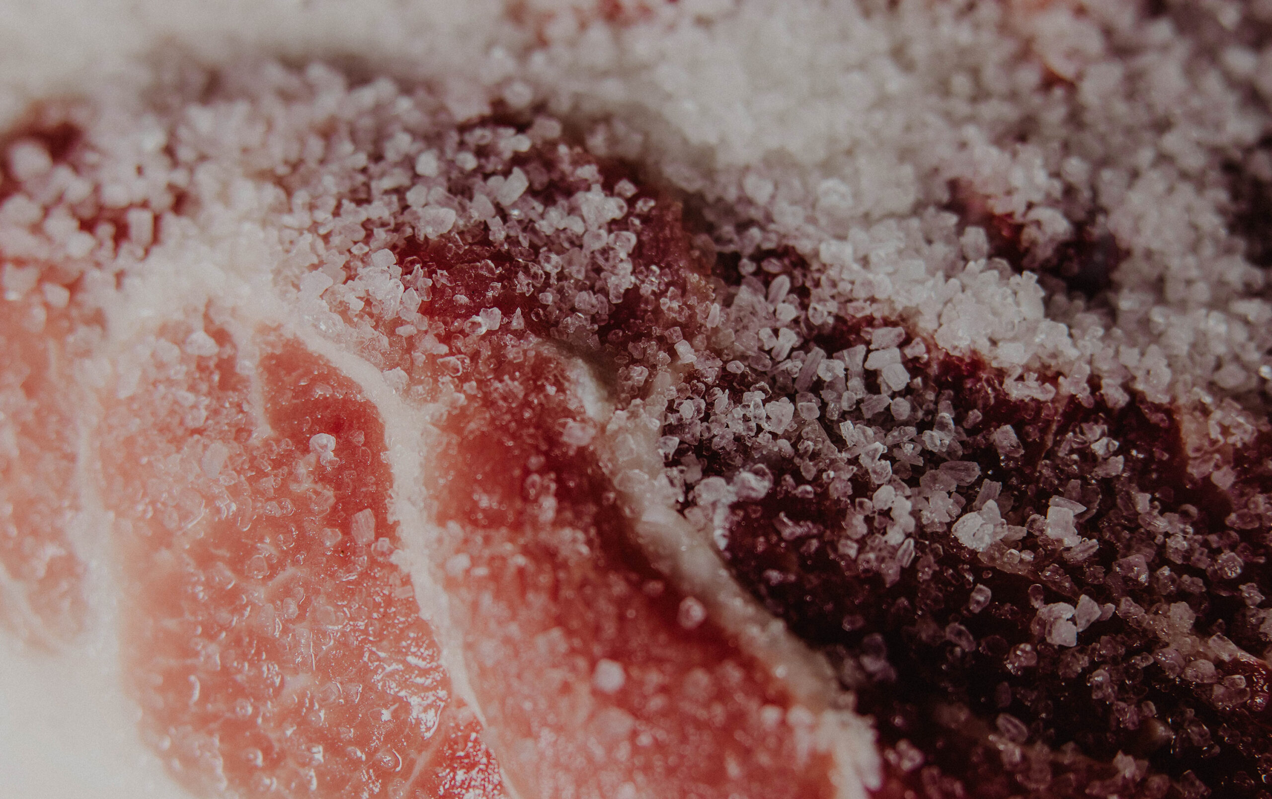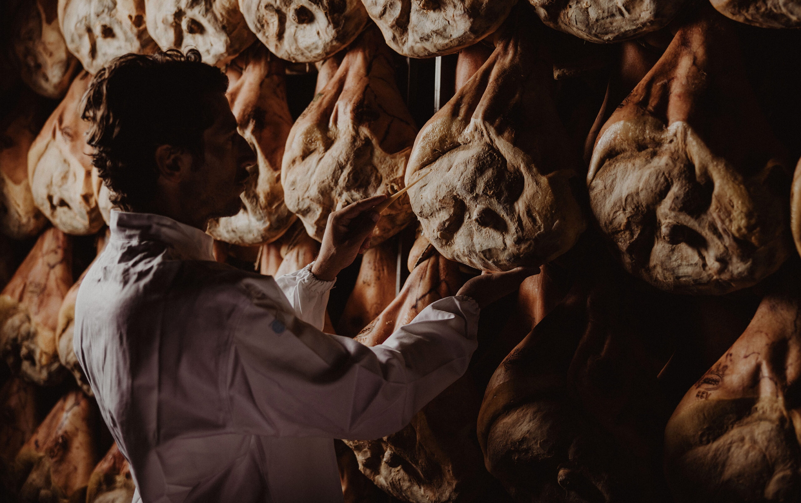 Nella fase iniziale, la coscia viene sottoposta a due distinti momenti di salatura, in cui viene massaggiata con sale marino puro e conservata in celle a temperatura e umidità controllate.